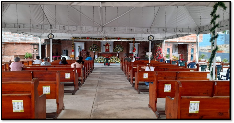 Poco a poco y sin dejar de lado la gratitud al Buen Dios por su bendición diaria se logran hacer morteros en la parte central del lote, se adecúa el altar en adobe, un espacio para el sagrario y la sacristía, una habitación para el descanso y vivienda del párroco. Se logra también instalar tres carpas donadas para mejorar las condiciones de lluvia y calor en los encuentros religiosos. Todo esto se alcanza gracias al buen corazón y donaciones de personas de la comunidad y externas a ellas, quienes se han convertido en benefactores y se han enamorado del proyecto por la transparencia con la que se ha realizado.
